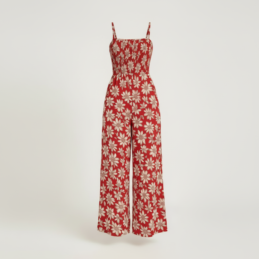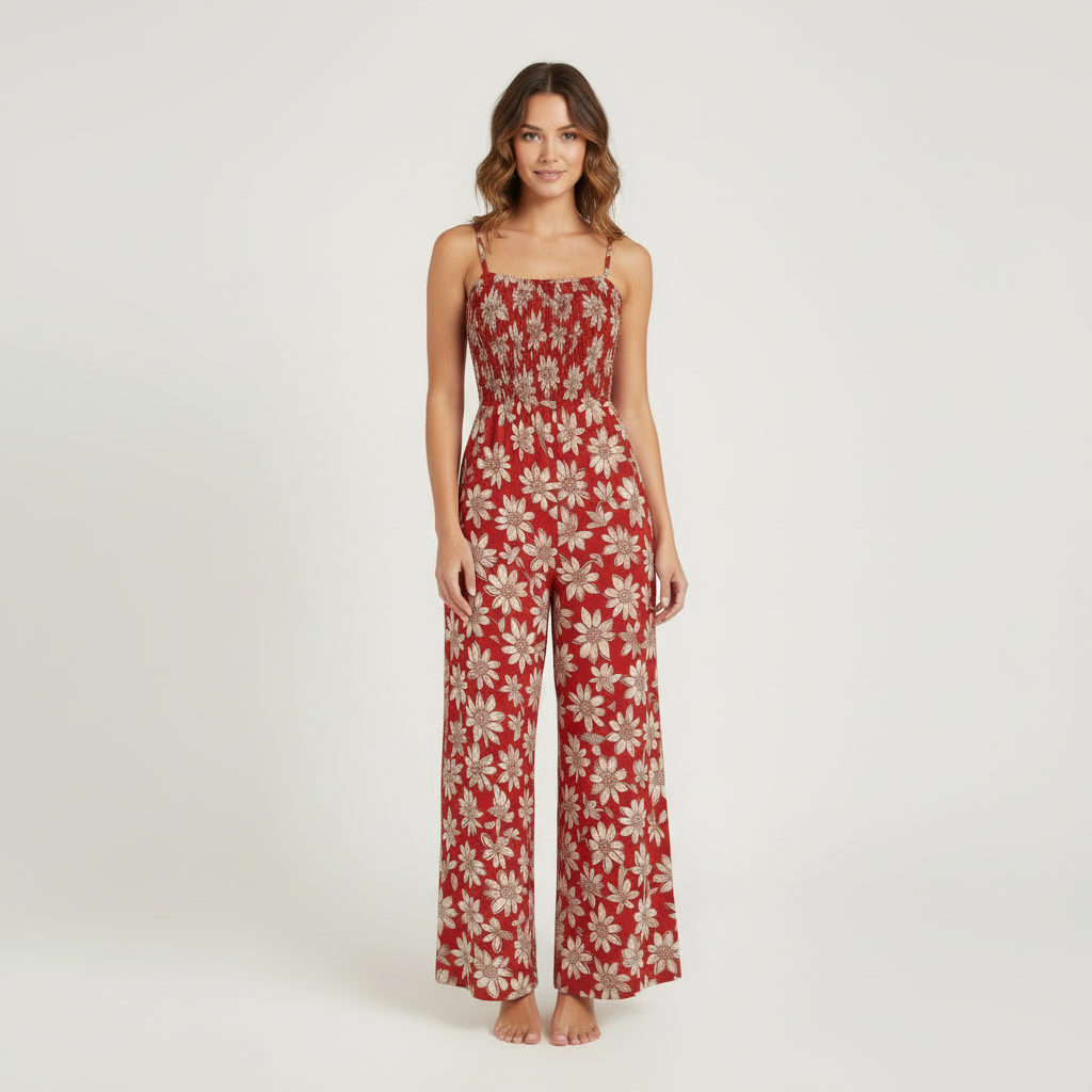 This floral print women's jumpsuit features a smocked bodice that beautifully enhances your silhouette while ensuring comfort. The wide leg design provides a relaxed fit, making it a perfect choice for warm weather. With practical pockets, this jumpsuit is versatile enough for casual outings or special occasions.