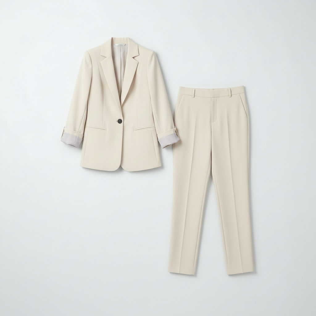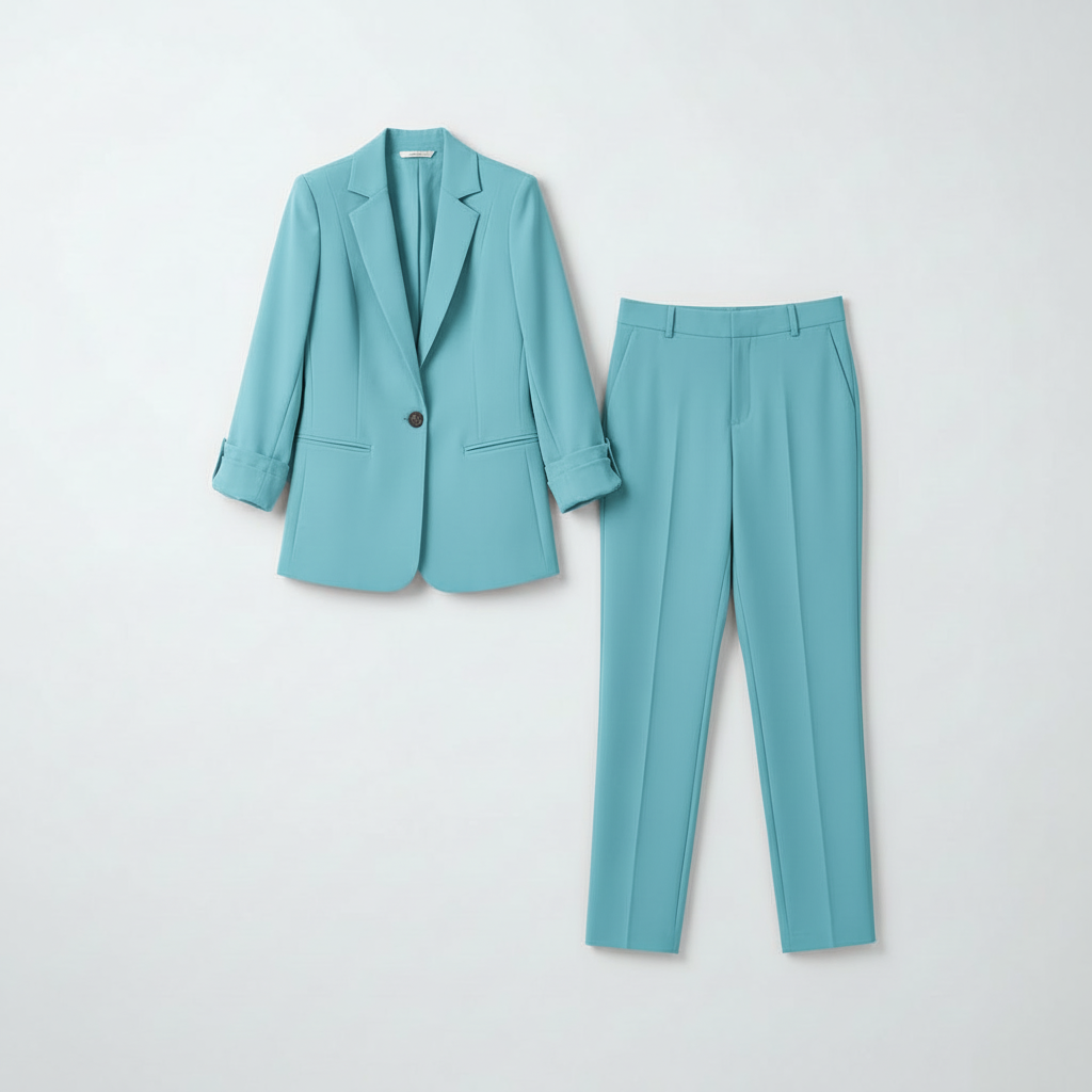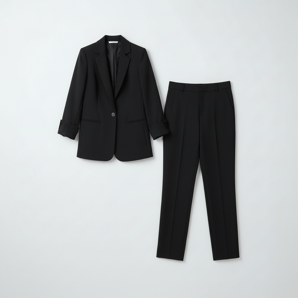 This one button blazer and trouser set combines polished sophistication with modern style. The tailored blazer features a single button closure, creating a sharp, streamlined look that flatters the figure. Paired with matching trousers, this set is perfect for business meetings, formal occasions, or a chic day at the office.