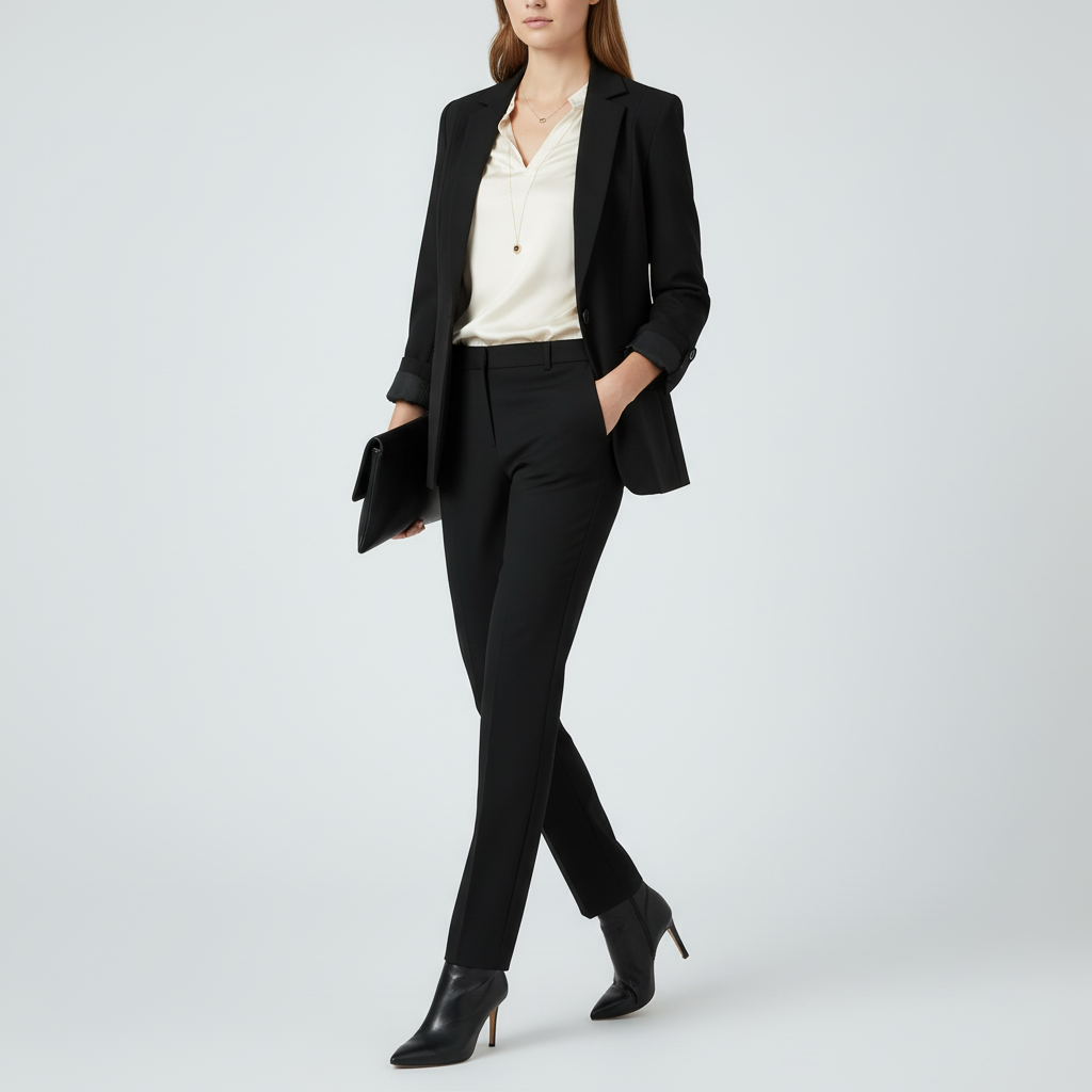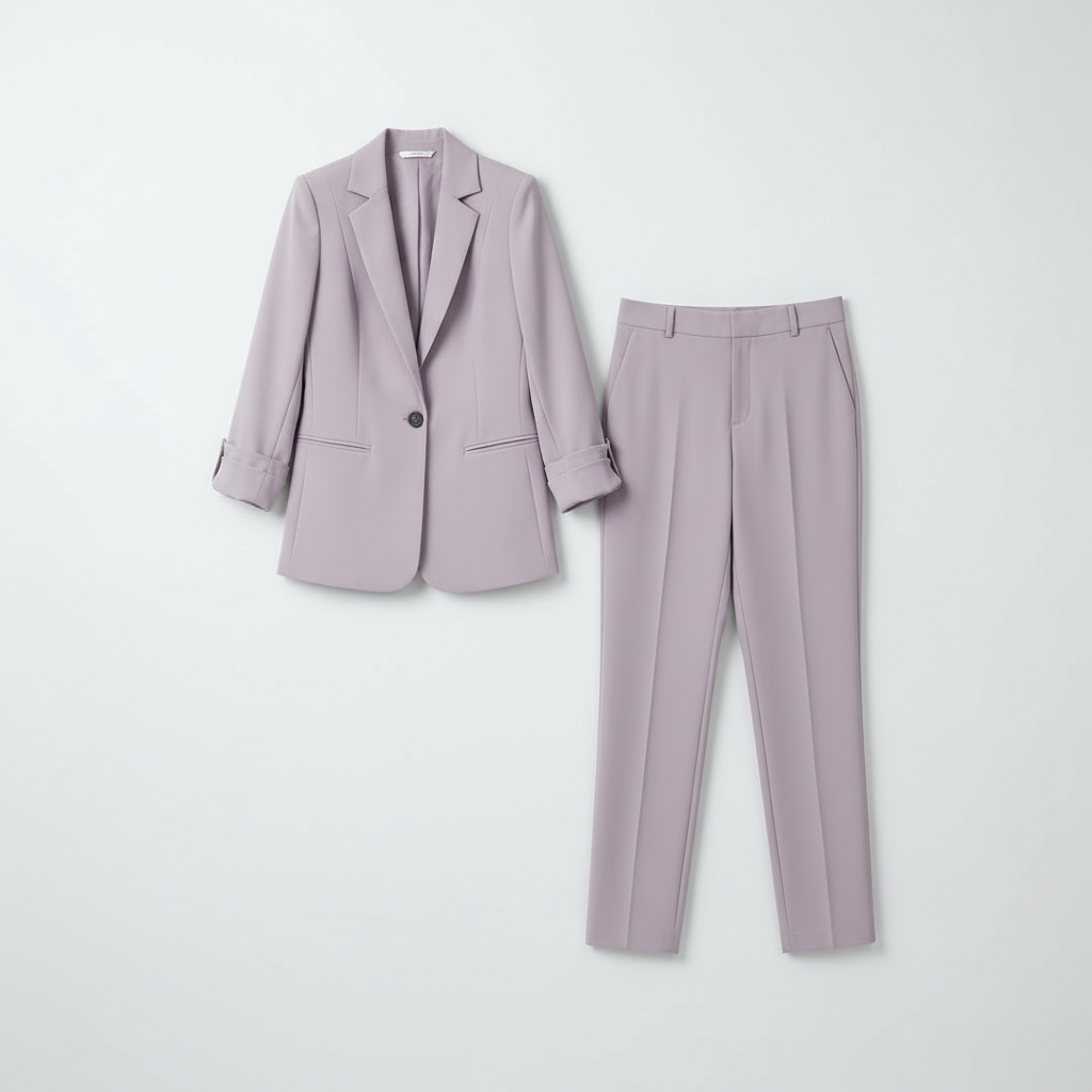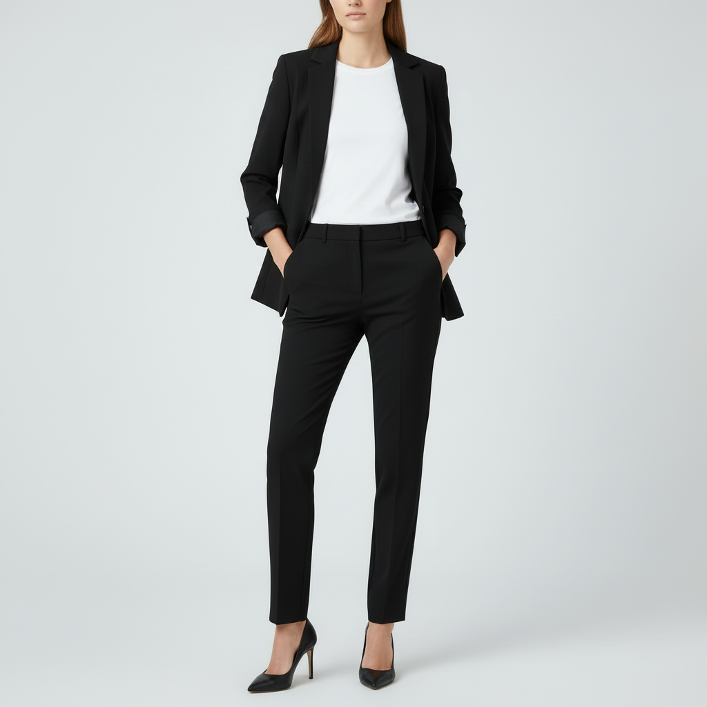 This one button blazer and trouser set combines polished sophistication with modern style. The tailored blazer features a single button closure, creating a sharp, streamlined look that flatters the figure. Paired with matching trousers, this set is perfect for business meetings, formal occasions, or a chic day at the office.